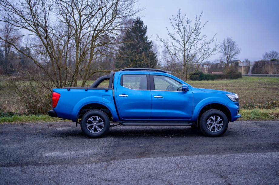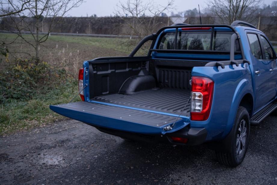 The cargo box measures 1.85 m (inner length) with class-leading inner width and a wear-resistant bedliner as standard. The rear suspension's high-strength leaf springs increase stiffness by 50%, so the truck resists nose-up posture under load. A 160-strengthened leaf spring (spray-marked) underscores the upgrade. We reinforced the tailgate hinges from 2.5 mm to 4.0 mm, raising the rated tailgate load from 250 kg to 600 kg - a 140% increase - so loading outboards or ice-heavy coolers is simpler and safer. A full-steel roll bar and external rope hooks speed up tie-downs for rods and traps.